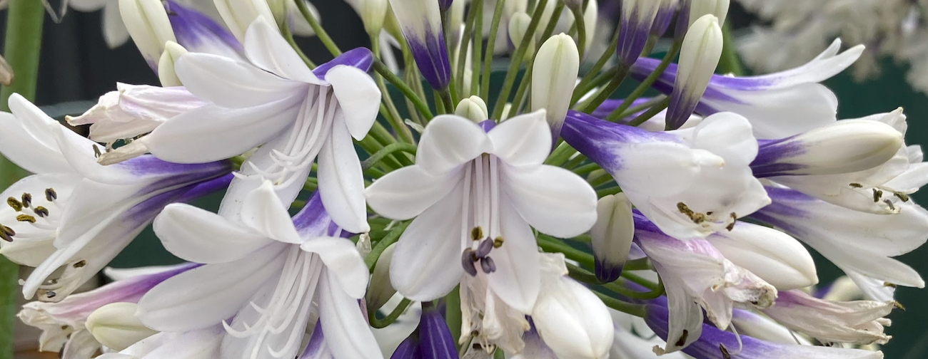 Catherine™ (Praecox ssp orientalis PMB024) a smaller to medium sized evergreen compact bi-colour agapanthus bred by Pine Mountain Botanics Pty Ltd. It has dark green foliage and masses of beautifully shaped dark purple and white bi-colour flowers from spring.